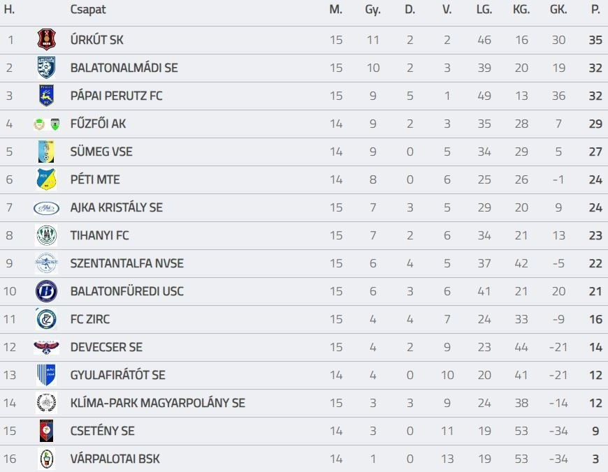 A naptári év utolsó, tizenhatodik körét rendezik meg hétvégén vármegyénk I. osztályú labdarúgó-bajnokságában. A pontvadászat továbbra is kiélezett: a listavezető Úrkút csupán három ponttal előzi meg az azonos egységgel álló Balatonalmádi és Pápa együttesét.