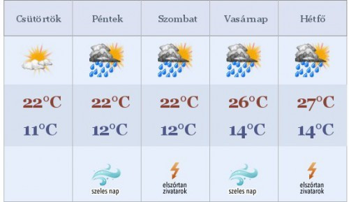 Csütörtökön reggel változóan felhős égboltra tekinthetünk majd fel, csapadéktól nem kell tartanunk. A szél a középső országrészben még élénk lehet, a legalacsonyabb hőmérsékletek 10 és 15 fok körül alakulnak majd. Napközben változóan felhős idő várható, főként északkeleten fordulhat elő zápor.