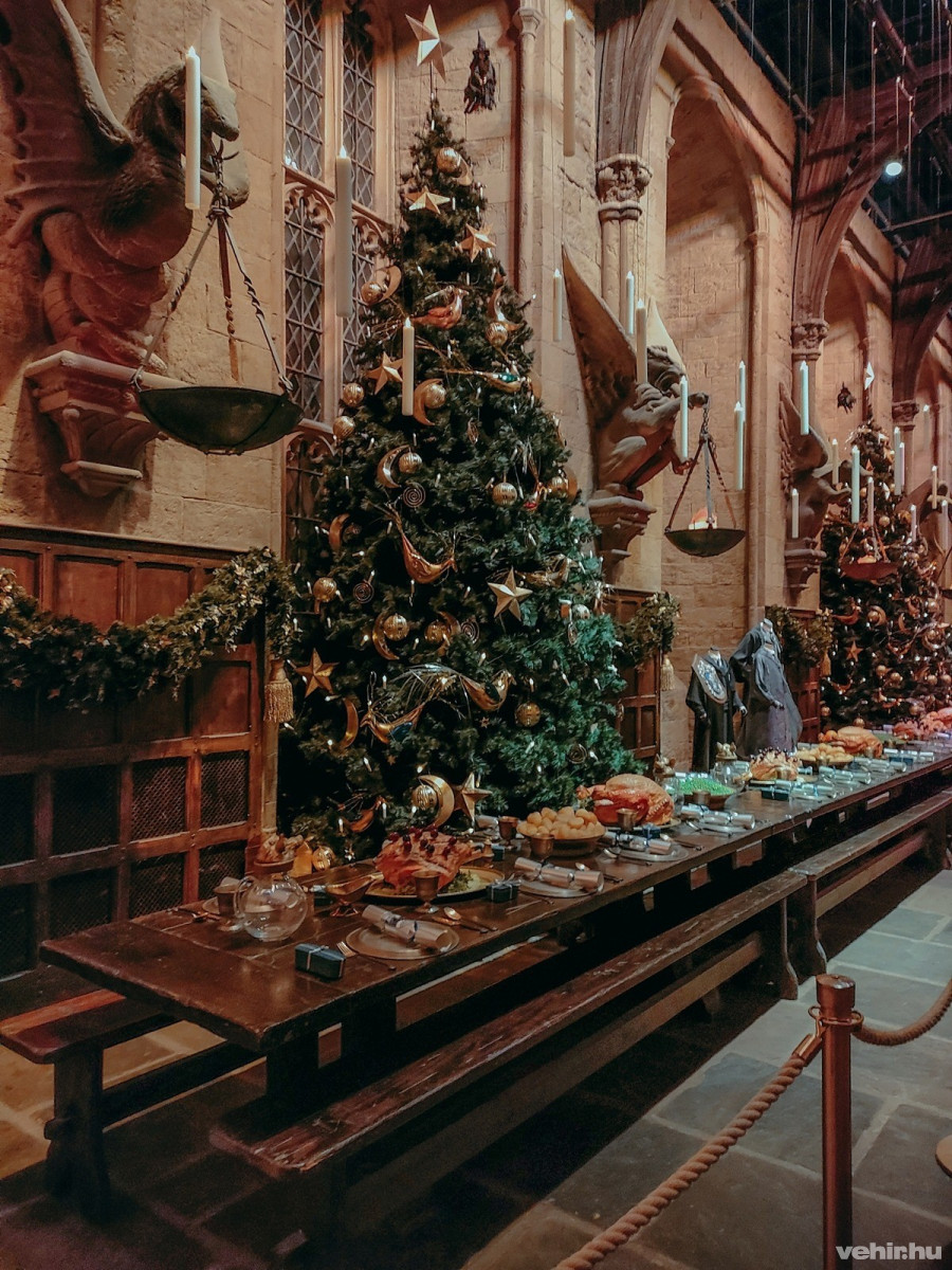 Mi ezt kihagyjuk; a Watford Junction állomásról induló Harry Potter emeletes busz e-jeggyel is ingyen kivisz a stúdióba, ahol akad ennél jóval varázslatosabb dolog. Például amikor a hatalmas és komor varázslósakk figurák figyelő tekintete mellett belépsz az épületbe, végighallgatod a vetítőteremben a színészek videóüzenetét, aztán egyszer csak felgördül a vászon és kitárul előtted a Nagyterem ajtaja. Ez tényleg olyan, mintha hosszú évek vágyakozása után végre megérkeztél volna Roxfortba. Pedig csak díszlet, a kupola nincs elvarázsolva, kilátszanak a fém tartóoszlopok, ráadásul négy éve egyszer már jártam itt. Mégis magába szippant az egész, ahogy teljes ünnepi pompában ragyog a csarnok: az asztalok gazdagon terítve, a plafonról gyertyák lógnak le, a karácsonyfák körül apró boszorkányok keringenek.