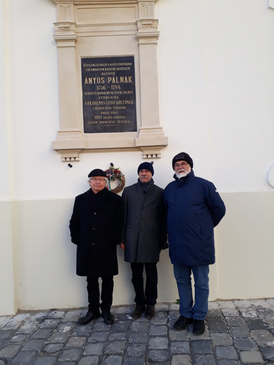 Veszprémben három helyi irodalmár, Csaba Ferenc, költő, Kilián László, író és Fenyvesi Ottó, költő helyeztek el koszorút Ányos Pál emléktáblájánál. (A képen.)