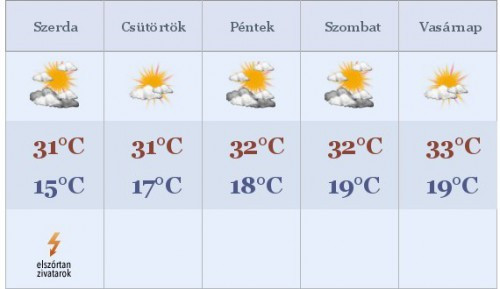 Csütörtökön hajnalban kisebb záporeső a Tiszától keletre előfordulhat, másutt továbbra is kevés felhő marad az égen. Mérsékelt szél mellett 14-19°C közé hűl a levegő. Napközben marad a többórás napsütés, sokfelé 30°C feletti maximumokkal.
