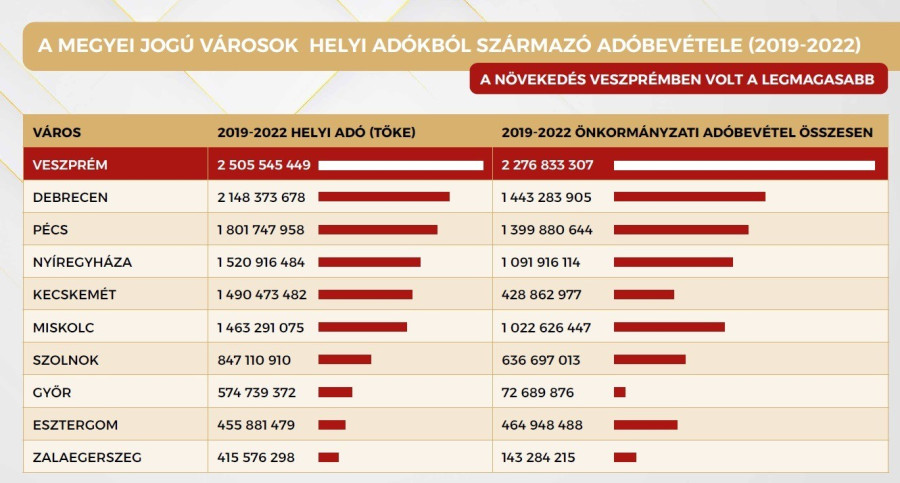 Szerkesztőségünk birtokába jutott egy statisztika, ami a 2019-2022 közti időszak helyi adókból befolyt összegét állította sorba a megyei jogú városok között, Veszprém pedig toronymagasan az élen végzett.