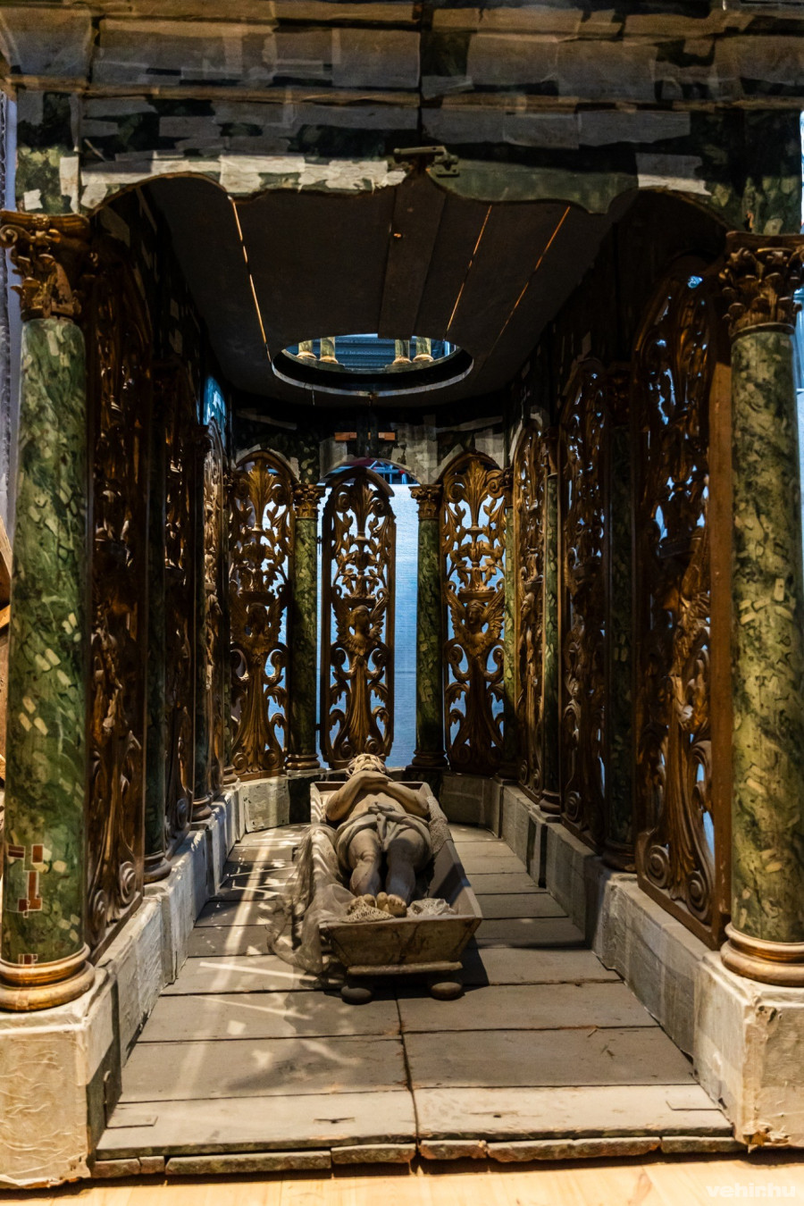 A piarista templomban egy különleges építmény fogadta a látogatókat az állványok gyűrűjében: márványnak tűnő oszlopok övezte, aranyozott faragványokkal díszített, kupolás kápolna, melyben a ravatalon Krisztus szobra fekszik. A szent sírt ábrázoló installáció a 18. században készült, és a Pápa környéki Ugod településen használták a húsvéti liturgia díszleteként. Nagypénteken állították fel, és a virrasztáskor, amikor csak gyertyák világították a templomban, szakrális hangulatot teremtett az építmény.