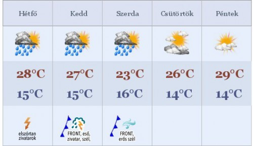 Kedden egy hidegfront vonul át felettünk, eleinte nyugaton, majd később keleten fordulhat elő csapadék. Zivatar kialakulása a Dunántúlon, majd a déli, és keleti tájakon valószínű. Az északnyugati szél megerősödhet. Hajnalban 12-17°C-ig hűl a levegő, napközben 24-28°C között alakulnak a maximumok.