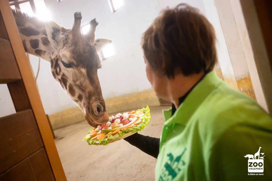 Egy születésnap természetesen nem az igazi torta nélkül, így Kati összeállított egyet Zuri kedvenceiből, répából, almából, hagymából és salátából, amelyet a zsiráflány nagy örömmel fogadott.
