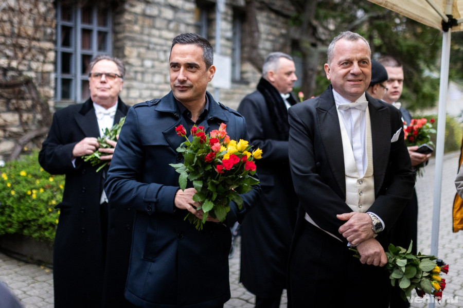A köszöntők után felcsendültek az ismert dallamok, miközben minden jelenlévőnek egy szál virággal kedveskedtek a színművészek.