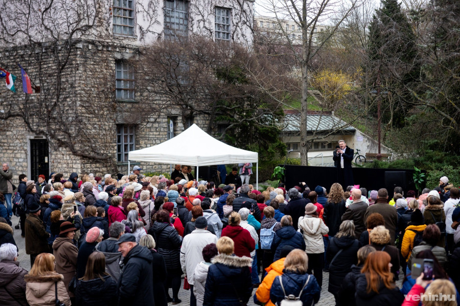 A hűvös idő ellenére pénteken délután megtelt a színház előtti tér, ahová a Petőfi Színház invitálta elsősorban a női közönségét, hogy egy vidám zenés műsorral köszöntse őket nőnap alkalmából.