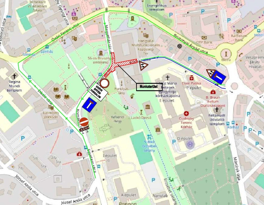 • A kivitelezés I. üteme alatt az Eszterházy Antal utcának a Szent István utca – Jókai Mór utcai kereszteződését zárják le. Az Eszterházy Antal utcai forgalom a Veszprémvölgyi utca – Kittenberger Kálán utca terelő útvonalon halad a Jókai Mór utca irányába. Ezen időszak alatt a Kittenberger Kálmán utca egyirányú forgalmi rendje megfordul a Jókai Mór utca irányába és az utca teljes hosszában megállási tilalom lép életbe. A Szent István utca korlátozások mellett, de változatlan forgalmi rend szerint használható marad. Az I. építési ütem előreláthatólag a 2024. március 18-25. közötti időszakban zajlik.