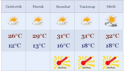 Csütörtökön a délelőtt folyamán ott is csökken a csapadékhajlam, így csütörtökön igazi nyári időre készülhetünk újra. Az északnyugati szél mérséklődik. Hajnalban 11-16°C-ig hűl a levegő, napközben ismét 25-30°C közötti értékeket mérhetünk. Péntekre nem várható nagy mértékű változás időjárásunkban, száraz levegő áramlik fölénk, így sok lesz a napsütés, csapadék nem valószínű. Gyengül a szél, hajnalban 10-15°C, napközben 26-31°C várható.