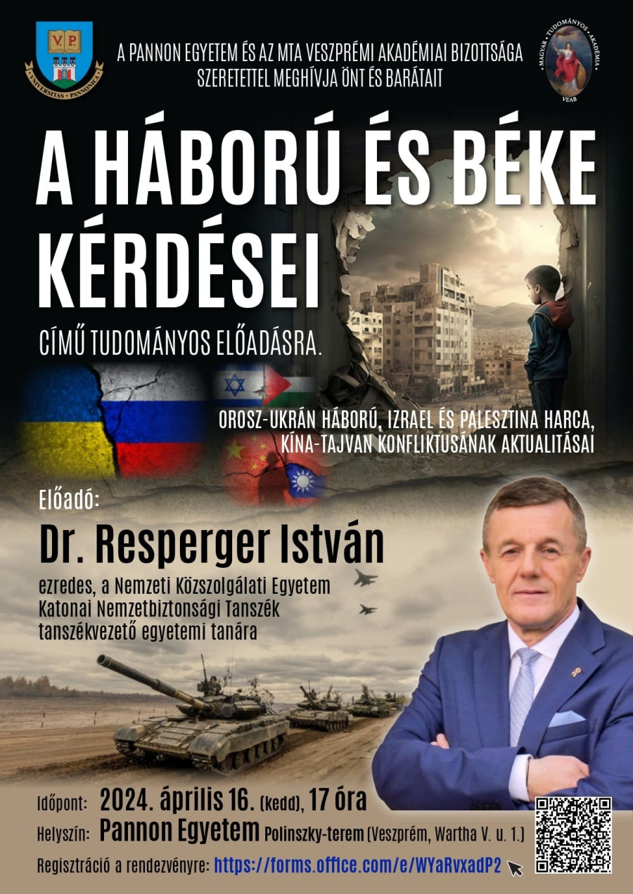 Resperger István ezredesnek, egyetemi tanárnak, a Nemzeti Közszolgálati Egyetem Katonai Nemzetbiztonsági Tanszék vezetőjének, több százezres nézettségű podcastok és médiaműsorok állandó szereplőjének tudományos előadását hallgathatják meg az érdeklődők 2024. április 16-án, kedden 17 órai kezdettel a Pannon Egyetem Polinszky-termében (Veszprém, Wartha Vince utca 1.).