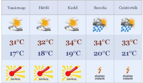 Vasárnap sokfelé derült égre, napsütéses reggelre ébredhetünk, majd napközben keleten és délnyugaton előfordulhat elszórtan lokális futózápor, esetleg zivatar. A szél nyugaton gyenge, keleten mérsékelt marad. Hajnalban 15-20°C várható, napközben marad a kánikula, 30-34°C valószínű.