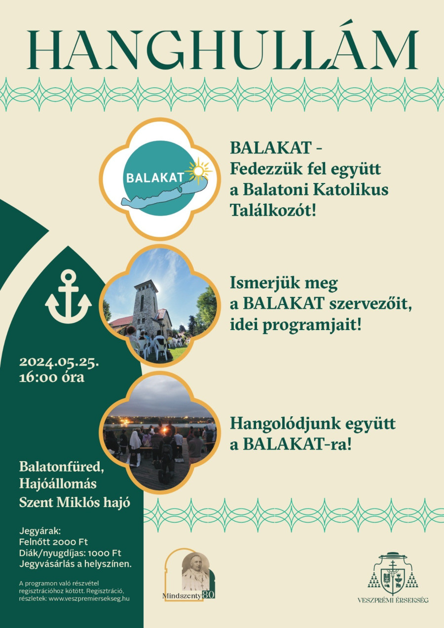 Május 25-én, szombaton 16 órai kezdettel egy rendhagyó programot tűztek műsorra a szervezők: az út során minden vendég megismerheti, hogy, mi is az a BALAKAT. A hajózás közben bemutatkoznak az esemény szervezői, majd zenével, elmélkedéssel, beszélgetéssel hangolódhatnak rá a júniusban, Balatonfűzfőn megrendezésre kerülő 50 órás Bódi Mária Magdolna Szentségimádási Hétvégére.