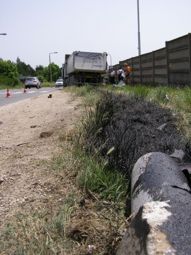 A baleset a késő délutáni órákban történt a vasúti átjáró és a papkeszi elágazás közvetlen közelében, amikor egy Litér felől érkező nyerges vontató letért az útpályáról és kidöntötte a jelzőtáblát, valamint a kandelábert.