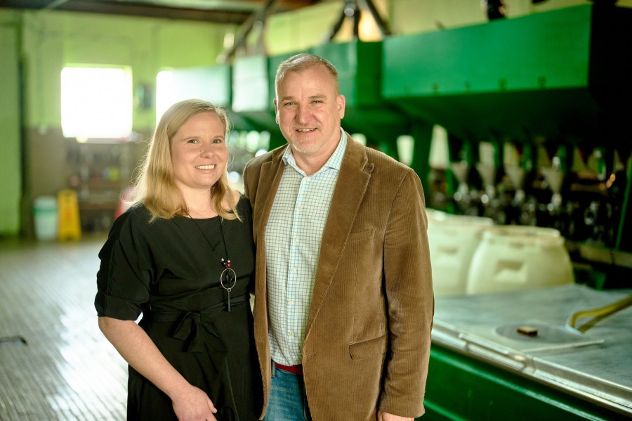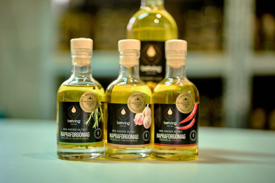 Papkeszi külterületén, egy egykori TSZ majorban vagyunk. A raktárban hatalmas zsákokban több tonna napraforgómag; a szomszédos helyiségben nagy teljesítményű gépek „morognak” épp, préselik és szűrik ki az olajat sűrített levegős eljárással, hogy az aranyló folyadék aztán egy ujjnyi vékony csövön keresztül az ízesítéshez használt tartályokba folyjon: jelenleg chilis, rozmaringos és sós-fokhagymás ízekben készülnek a fűszerolajak, de Behring Balázs és párja, Gyulai Renáta tervei között szerepel a jövőben például szarvasgombás változat is. Hihetetlen szenvedély fűti őket és tele vannak ötletekkel.