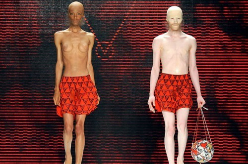A müncheni divattervező, Patrick Mohr a modellvilág legvitatottabb témájával rukkolt elő. A kifutóján meztelen felsőtestű, anorexiás nő állt párba boxeralsóban egy férfi modellel, mindkettőre kopasz maszkot és gyér szakállat ragasztott. Mohr híres uniszex vonaláról a két alak közül a nőt csak a csontsovány felsőtesten éktelenkedő szilikonmellről lehet felismerni.