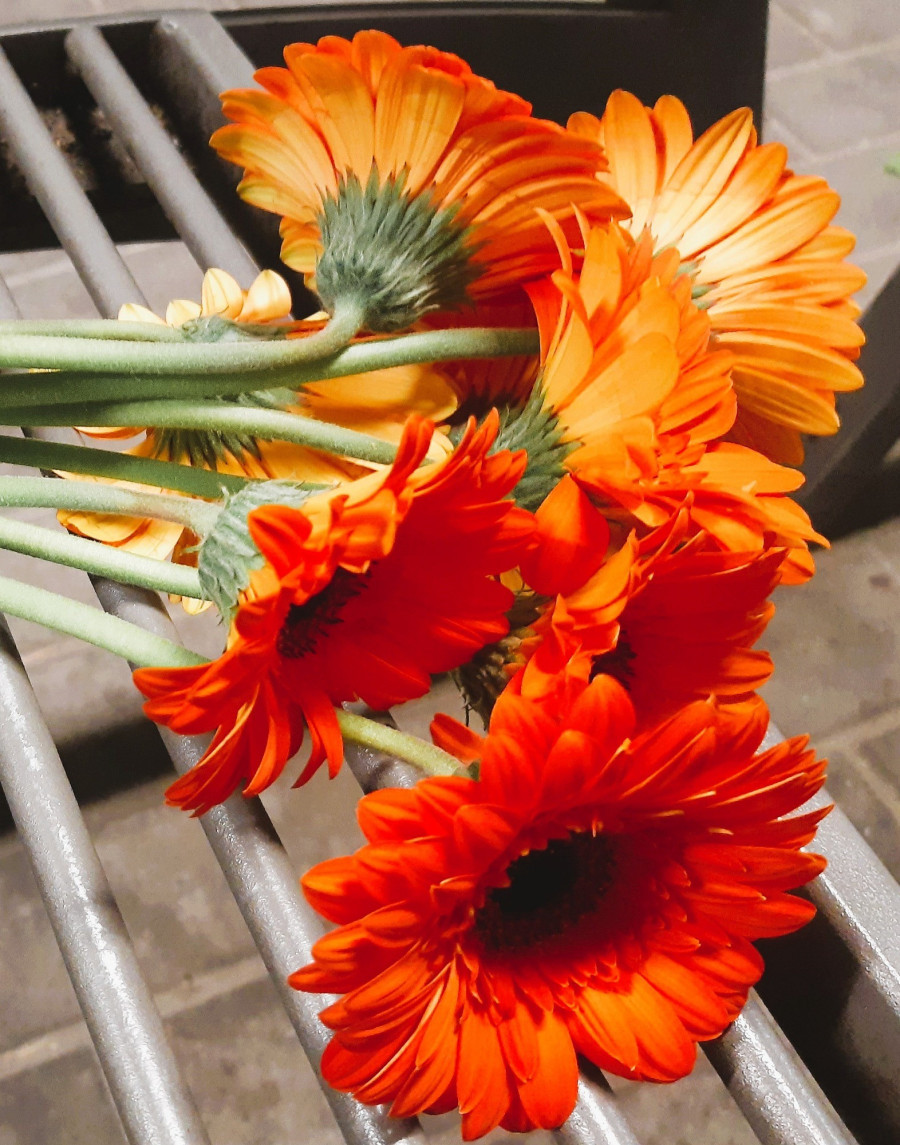 Nem is nagyon gondolkodom, csak kirántok egy szál gerberát a csokromból – lesz még a születésnapomra tervezett harmincháromhoz elég. Narancsszínű, mint a nyári alkonyat; bazsarózsát akartam, de ezt nem lehetett otthagyni.