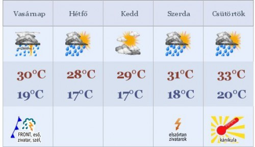 Vasárnap napközben a front tovább halad a keleti országrész felé, továbbra is többfelé záporokat, zivatarokat okozva. A zivatarok közt egy-egy hevesebb is előfordulhat, viharos széllel, jégesővel, jelentősebb csapadékkal. A front mögött a Dunántúlon már visszaesik a hőmérséklet, ott 24-27 °C várható a délutáni órákban. A keleti országrészben, ahová csak később érkezik a front, még 28-30 °C közé melegedhet a levegő, délkeleten akár 30 °C fölé is felkúszhat a hőmérséklet. Hétfőn reggel a Dunától keletre még többfelé várható csapadék, a Dunántúlon is közepesen felhős égre ébredhetünk. Hajnalban 15-20 °C valószínű.