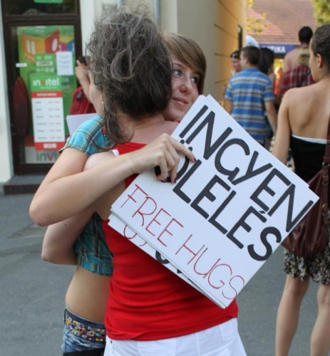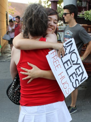 Igen ingyen öleléssel, méghozzá az Utcazenén. Sokan hallhattak már az ingyen ölelés mozgalomról, ami nem más, mint lehetőség egy ölelésre, valóban ingyenesen. Az aktivistákkal, mi a Kossuth utcán találkozhattunk kezükben INGYEN ÖLELÉS – FREE HUGS feliratú táblákkal, bárki odamehetett és megölelhette őket.