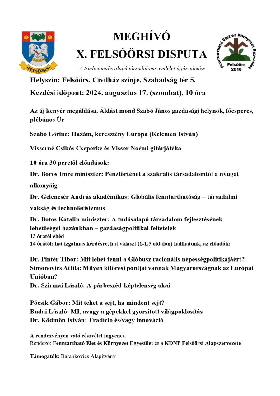 Augusztus 17-én tizedik jubileumi tizedik alkalommal találkozik az az értelmiségi kör Felsőörsön, akik elkötelezettek abban, hogy rávilágítsanak a világban zajló negatív tendenciákra, de ami ennél sokkal lényegesebb, reális alternatívákat fogalmazzanak meg a változásra, mindezt globális szinten. A