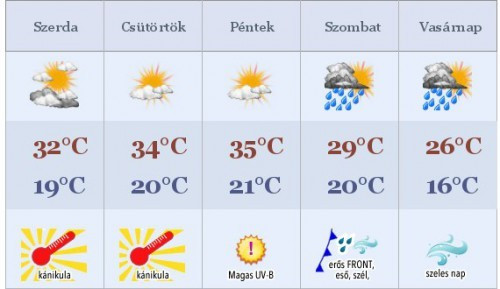 Az éjszaka folyamán helyenként - elsősorban keleten - még előfordulhat zápor, zivatar, ám reggelre csökkenni fog a felhőzet mennyisége. Szerdán napközben visszatér a kánikula, a sok napsütés mellett elszórtan - legkisebb eséllyel nyugaton - alakulhat ki frissítő zápor, zivatar. Szerdán 17 és 22°C körüli minimumokra számíthatunk, míg a legmagasabb hőmérsékletek a 30-34°C-ot is elérhetik.