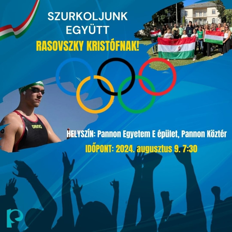 Szurkoljunk együtt Rasovszky Kristófnak, a Pannon Egyetem büszkeségének, aki nyílt vízi úszásban képviseli hazánkat a párizsi olimpián! – tette közzé a Facebookon a veszprémi egyetem, akik hozzátették, hogy a szurkolói akció nem csak az egyetem dolgozóinak és hallgatóinak nyitott, bárki ellátogathat az E-épületben lévő köztérbe, hogy igazi közösségben szurkolhasson a veszprémi sportolóknak.