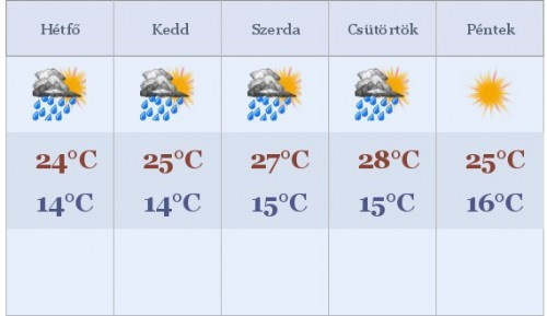 Hétfőn reggel helyenként továbbra is élénk vagy erős lesz az északnyugati szél. Hajnalban 11-15 °C valószínű. Hétfőn napközben többnyire erősen felhős lesz az ég, csak a déli területeken süthet ki néhol a Nap. A csapadékzóna lassan elmozdul, továbbra is többfelé várható záporeső, gyenge eső. A szél csak napközben mérséklődik, délután 19-24 °C valószínű.