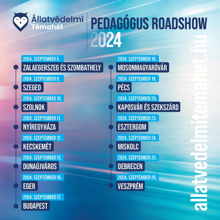 A Pedagógus Roadshow 17 helyszínen kerül megrendezésre 2024. szeptember 5. és 26. között, többek között Zalaegerszegen, Szombathelyen, Szegeden, Szolnokon, Nyíregyházán, Kecskeméten, Dunaújvárosban, Egerben, Budapesten, Mosonmagyaróváron, Pécsen, Kaposváron, Szekszárdon, Esztergomban, Miskolcon, Debrecenben és Veszprémben. A roadshow célja, hogy térítésmentes állatvédelem-pedagógiai oktatásban részesüljenek a bölcsődében, óvodában, általános iskolában, középiskolában és gyermekotthonban dolgozó pedagógusok és szakemberek.