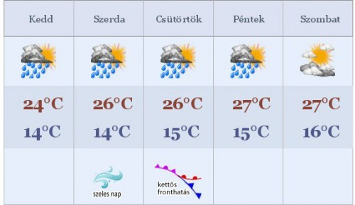 A Dunántúlon megélénkül, a Kisalföldön megerősödik az északi, északnyugati szél. A délutáni órákban 20-25 °C várható, a csapadékos területeken alakulhat kevéssel 20 °C alatt a csúcshőmérséklet. Szerdán reggel a délnyugati tájak kivételével erősen felhős égre ébredhetünk, az északkeleti tájakon további csapadék valószínű. Az északi és a középső országrészben élénk lesz a nyugati szél. Hajnalban 12-17 °C valószínű.