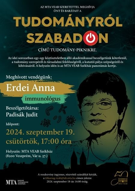 Erdei Anna Széchenyi- és Prima Primissima díjas magyar immunológus, akadémikus, az ELTE professzora, az Innsbrucki Egyetem címzetes egyetemi tanára, korábban az Oxfordi Egyetem vendégkutatója volt. 2020 óta a Magyar Tudományos Akadémia főtitkárhelyettese. Fő kutatási területe a sejtimmunológia (különös tekintettel a veleszületett immunitás elemeire) és az egyes sejtmembrán-struktúrák szerkezeti és funkcionális sajátosságai. Kutatásai többek között hozzájárulnak az allergiás reakciók és a sclerosis multiplex folyamatának megértéséhez. A Padisák Judit akadémikussal folytatott beszélgetésen az immunológia szakterületének érdekességein túl a tudomány felelősségéről és társadalmi elfogadottságáról, a tudományos ismeretterjesztés kihívásairól, a hölgyek tudományos karrierlehetőségeiről