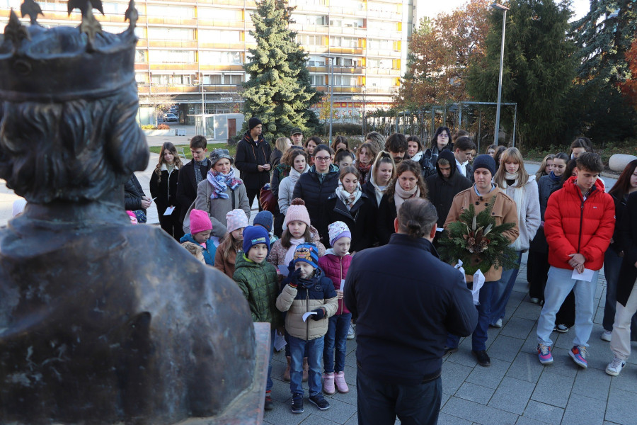 A Szent Imre téren álló szobor előtt kedden délelőtt a Padányi Katolikus Iskola és a Szilágyi Keresztény Iskola diákjai gyúltek össze, ahol Darnai István, a Padányi iskola lelki igazgatója rövid részletet olvasott fel Szent István Intelmek című művéből a fiatal hercegnek szól.
