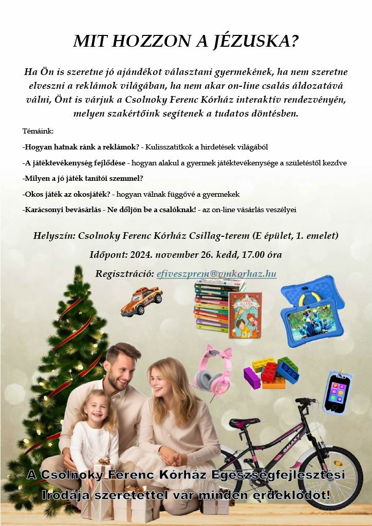 A rendezvényen szakértők segítenek abban, hogy a karácsonyi reklámdömpingben se vesszen el senki, hogy hogyan alakul át születéstől a kisgyermekek játéktvékenysége, milyen játékot érdemes választani, ha tanítói szemszögből is tekintünk ezekre az ajándékokra. Az előadáson ezeken kívül szóba kerül még okosjáték kérdésköre, valamint külön kitérnek az online csalások veszélyeire is.