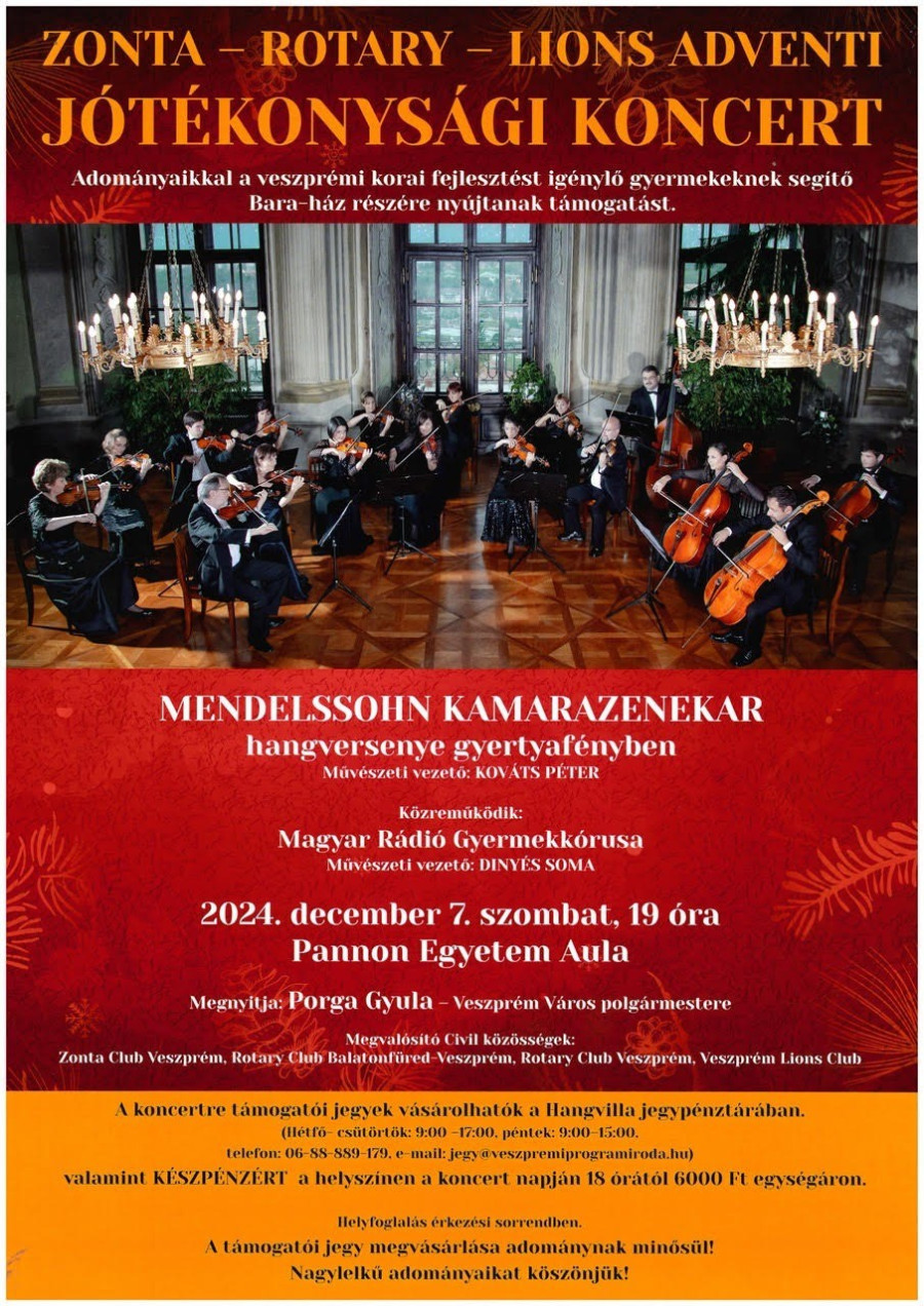 A koncerten az országosan ismert, de veszprémi székhelyű Mendelssohn Kamarazenekar a Magyar Rádió Gyermekkórusával fog fellépni december 7-én 19 órától a Pannon Egyetem Aulájában. Jegyeket a Hangvilla jegypénztárában lehet váltani.