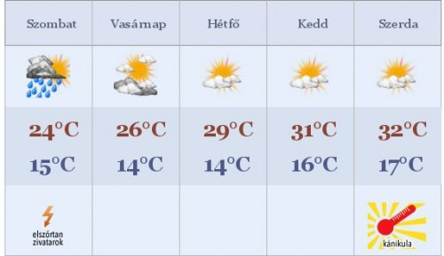 Szombaton reggel még többfelé erősen felhős lesz az ég, mérsékelt északnyugati, nyugati szél várható. 13 és 19 °C közé hűl a levegő. Napközben tovább csökken a felhőzet, egyre többfelé süt majd ki a Nap. Az északnyugati szél a középső országrészben néha megélénkül. A legmelegebb órákban 22-28 °C-ot mérhetünk.