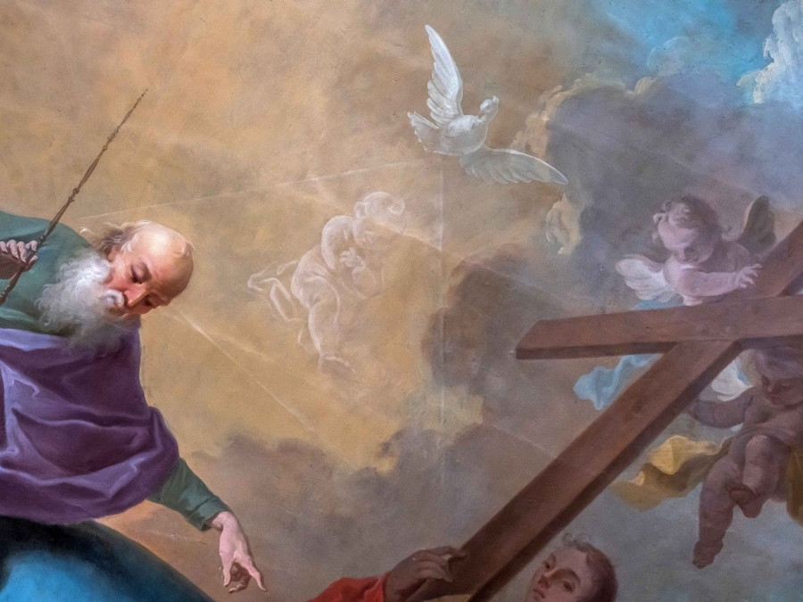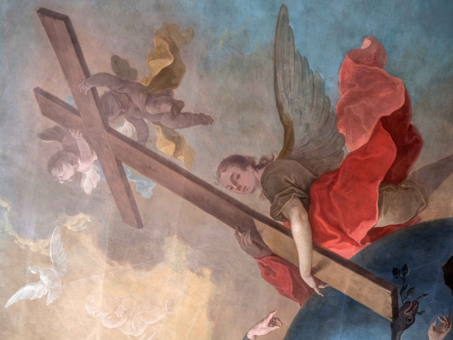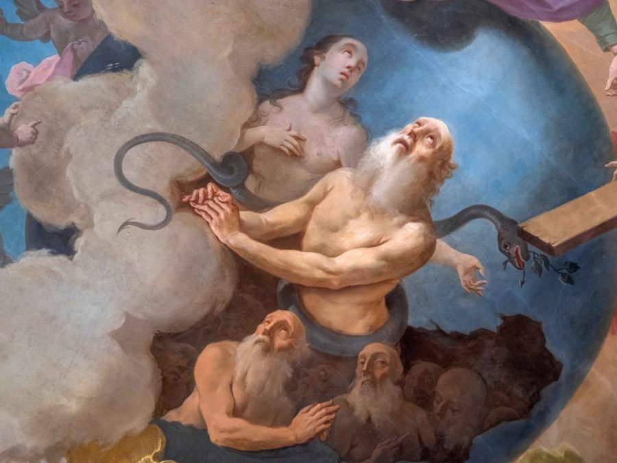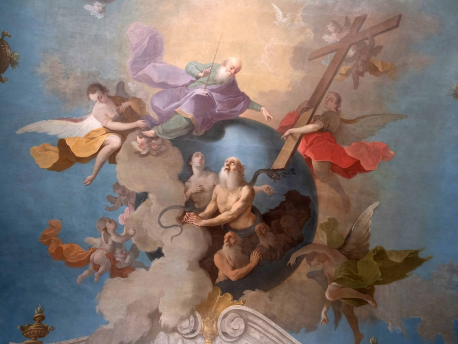 Az óriási kék földgömb belsejéből megváltás után sóvárgó emberek néznek áhítatos tekintettel felfelé. Ott van közöttük Ádám és Éva, akik a derekukra tekeredő kígyó, az ősbűn foglyai. Föntről a Teremtő szerető tekintetettel néz Ádámra, és elhatározza: megváltja bűneitől az emberiséget. Az Atya elhatározásaként, alig észrevehetően egy csecsemő alakja bontakozik ki a fényben, ő a megtestesülésre váró Fiú. Mellette angyalok emelik a magasba a megváltás szimbólumát, a keresztet, amelynek alsó sarka elpusztítja a kígyót. Ezt a jelenetet láthatjuk a veszprémi várnegyed egyik legkülönlegesebb és legkevésbé ismert szakrális terének mennyezetképén.