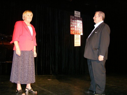 C. Szalai Ágnes a VMK megbízott igazgatójának köszöntője után Debreczenyi János polgármester méltatta az irodalmi színpad tevékenységét. Visszautalt az 50-es évekre, amikor a társulatot megalapította Pintér Tibor. Mint mondta, azokban az években elveszett a vox humana, vagyis az emberi hang, gyanús szemek figyeltek mindenütt és az emberek bezárkóztak, hogy senki se tudja, mit éreznek. Mert az érzelmek kimutatása egyenlő volt a kiszolgáltatottsággal. Pintér Tibor az Irodalmi Színpaddal újra visszaadta az emberi hangot, és kockázatok árán érezni tanította az embereket, - mondta a polgármester. Majd megjegyezte, hogy ma, amikor cinikus politikusok acsarkodnak egymás ellen a hatalomért, ma újra ugyan azt a világot éljük. Újra vissza kell adni, újra kell szülni az emberi hangot, ezért reméli, hogy az ötvenedik születésnapját ünneplő társulat sok ötven évet ünnepelhet még, és töretlenül folytatja munkáját.