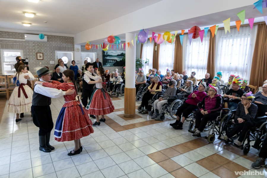 A farsangi ünnepségen a Szilágyi Erzsébet Keresztény Iskola néptáncosai szórakoztatták az intézményben ellátott időseket. A gyerekek magyar néptáncokból összeállított műsora mosolyt és vidámságot csempészett az otthon ebédlőjébe a szürke februári délelőttön.