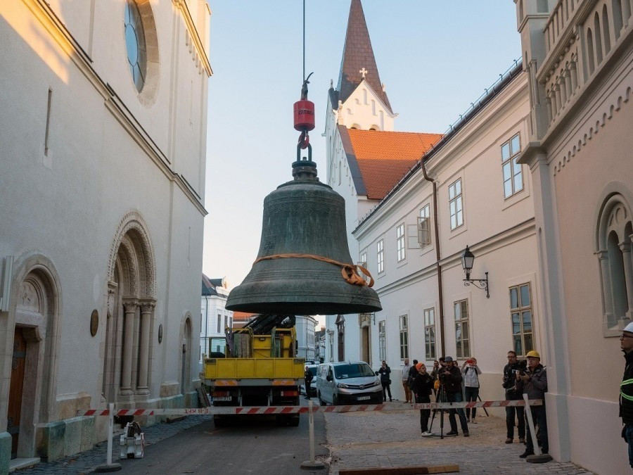 „A török kor utáni újjáépítés időszakától tudjuk dokumentáltan, hogy milyen harangjai voltak a székesegyháznak. Idén van a háromszázadik évfordulója annak, hogy a barokk stílusban újjáépített székesegyházba Franz Ulrich Scheicheltől, egy bécsi harangöntőtől megrendeltek négy nagyméretű harangot. Emellett lakott még két kisebb harang is a szentély fölötti kis huszártoronyban. Ez az állapot állt fenn egészen az első világháborúig, amikor hazánk templomainak jelentős részéből – ágyúöntés céljából – elvitték a harangokat. Ez nem kímélte meg a veszprémi székesegyházat sem. Az első világháború után egyetlen harang, a legnagyobb maradt csak meg. Ez mind a mai napig megvan, hazánk nagyharangjai közül ez a legidősebb. (…) A nagyharang már nagyon rossz állapotban volt, főként a felfüggesztése volt problémás, ezért egészen Tirolig, Innsbruckig kellett elszállítani. Ez a hatalmas harang 1725 óta nem hagyta el a tornyot. A templom 1907 és 1910 között átépítése során, amikor még a tetőt is elbontották, akkor is a helyén maradt. Nagy kihívás volt az elszállítása. Egy hatalmas hőpajzs alatt – időben pedig 2-3 hét alatt –, a harangot 800 fokra fölhevítve történt meg az újonnan megöntött úgynevezett korona hozzáhegesztése a haranghoz. Nemrég Innsbruckba látogattam a harangszakértőnkkel, és örömmel tapasztaltuk azt, amit az ottani mesterek is megerősítettek, hogy nagyon szép végeredményt kaptunk.”