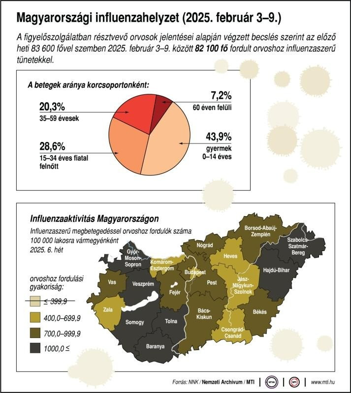 A 6. héten influenzaszerű megbetegedéssel orvoshoz forduló betegek 43,9 százaléka 14 év alatti, 28,6 százaléka a 15-34 éves, 20,3 százalékuk a 35-59 évesek, míg 7,2 százalékuk a 60 éven felüliek korcsoportjába tartozott.