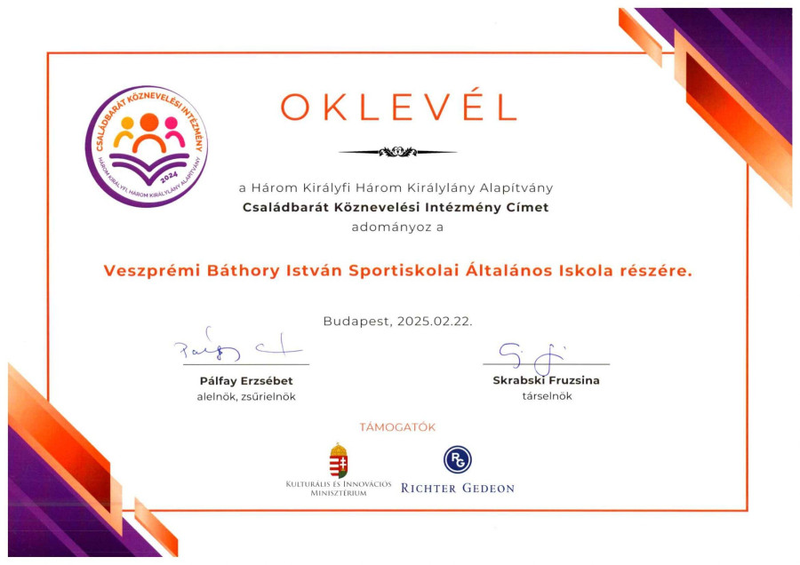 A címet minden évben az előzetesen összeállított szakmai szempontrendszer - hiteles módon bemutatott közösségépítő működési modell, családbarát jó gyakorlatok - alapján egy tizenegytagú zsűri – köztük Prof. Dr. Bagdy Emőke pszichológus, Uher Bertalan a veszprémi zeneiskola igazgatója és több más intézmény vezetője – ítéli oda. Az idei évben 166 pályázat érkezett be a bírálókhoz. Országosan 23 általános iskolának, köztük a Báthorynak ítélték oda a kitüntető Családbarát címet. Nagy eredménynek mondható, hogy az intézmény már az első pályázáskor címet nyert, míg két tucat iskola elismerő oklevélben részesült.