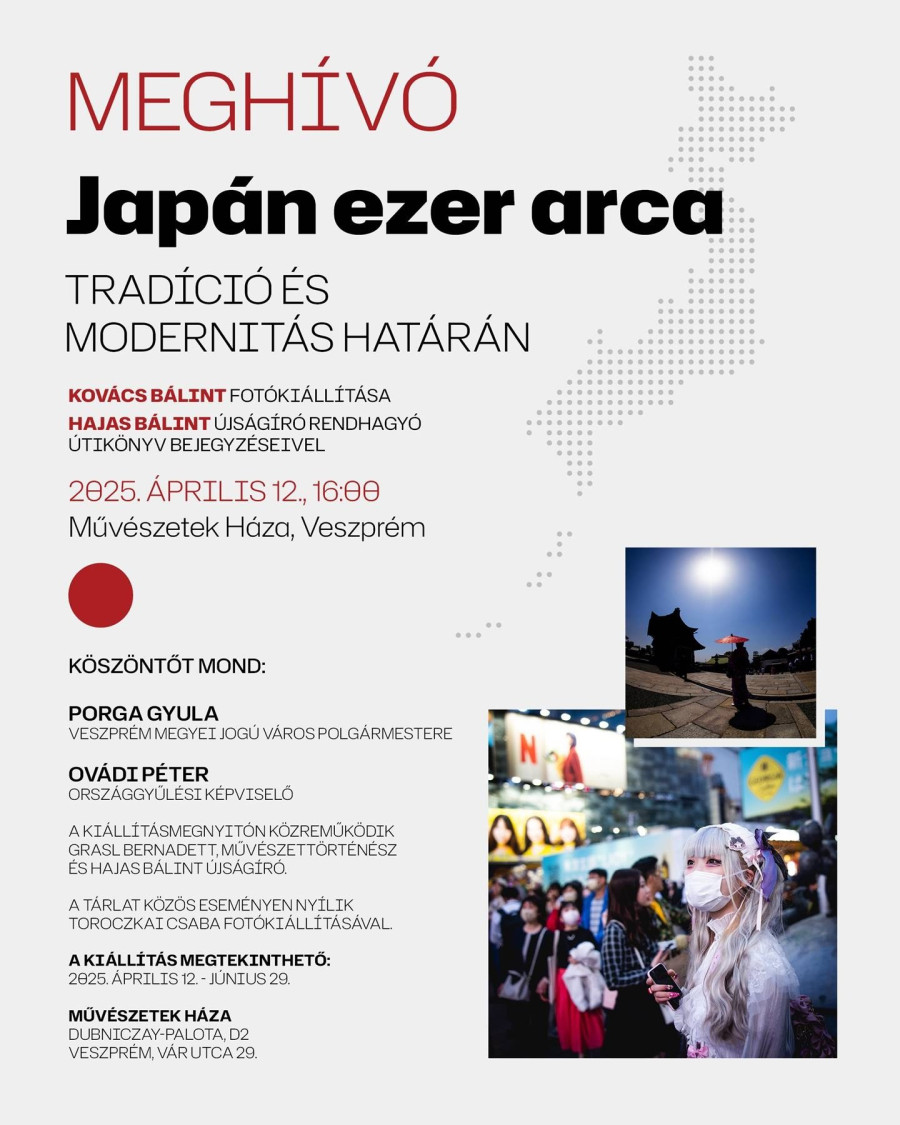 A „felkelő nap országának” kulturális hatása pedig nemcsak a megörökített pillanatokban és azok történetében ölt testet a kiállításon. Koska Hedviget, aki ugyancsak részt vett a japán utazáson, saját haiku versek megírására ihlették az ott szerzett emlékek, amik ugyancsak feltűnnek a kiállítás képei között. A kép és szöveg együttese így repít át a fél világon és mutatja be az ezerarcú Japánt veszprémi szemüvegen keresztül.
