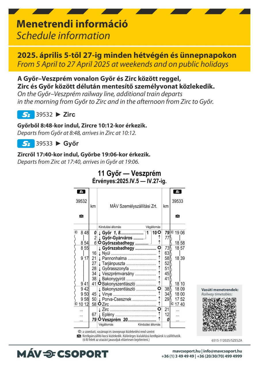 Április 5. és 27. között mentesítő vonatok közlekednek Győr és Zirc között a hétvégéken és ünnepnapokon.
