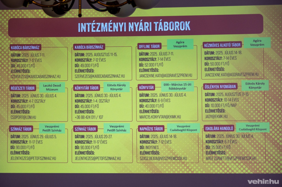 A sajtótájékoztatón az is elhangzott, hogy a város nyolc közművelődési és oktatási intézményétől is érkeztek táborkínálatok. A Kabóca Bábszínház, az Agóra Veszprém, a Laczkó Dezső Múzeum, az Eötvös Károly Könyvtár, a Petőfi Színház, az Állatkert, a Családsegítő Központ és a Pannon Egyetem összesen közel 35 tematikus tábort kínál, amelyek az általános iskolások mellett több helyen a nagycsoportos óvodásokat is várják. Az Agóra és a könyvtár például már 6 éves kortól fogad gyerekeket mesetáborba, kézműves programokra vagy művészeti foglalkozásokra. A családsegítő központ egész nyáron gyermekfelügyeletet is biztosít az Acticity épületében, óránként 1500 forintos díjért.