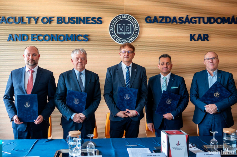 A megállapodást kedden délután Simon Attila, a Veszprém Vármegyei Kereskedelmi és Iparkamara elnöke, Tóth József Péter, a Pannon Egyetem rektorhelyettese és Csillag Zsolt kancellár, Porga Gyula, Veszprém polgármestere és Pleschinger Gyula, a Magyar Közgazdasági Társaság elnöke írta alá a Pannon Egyetemen.