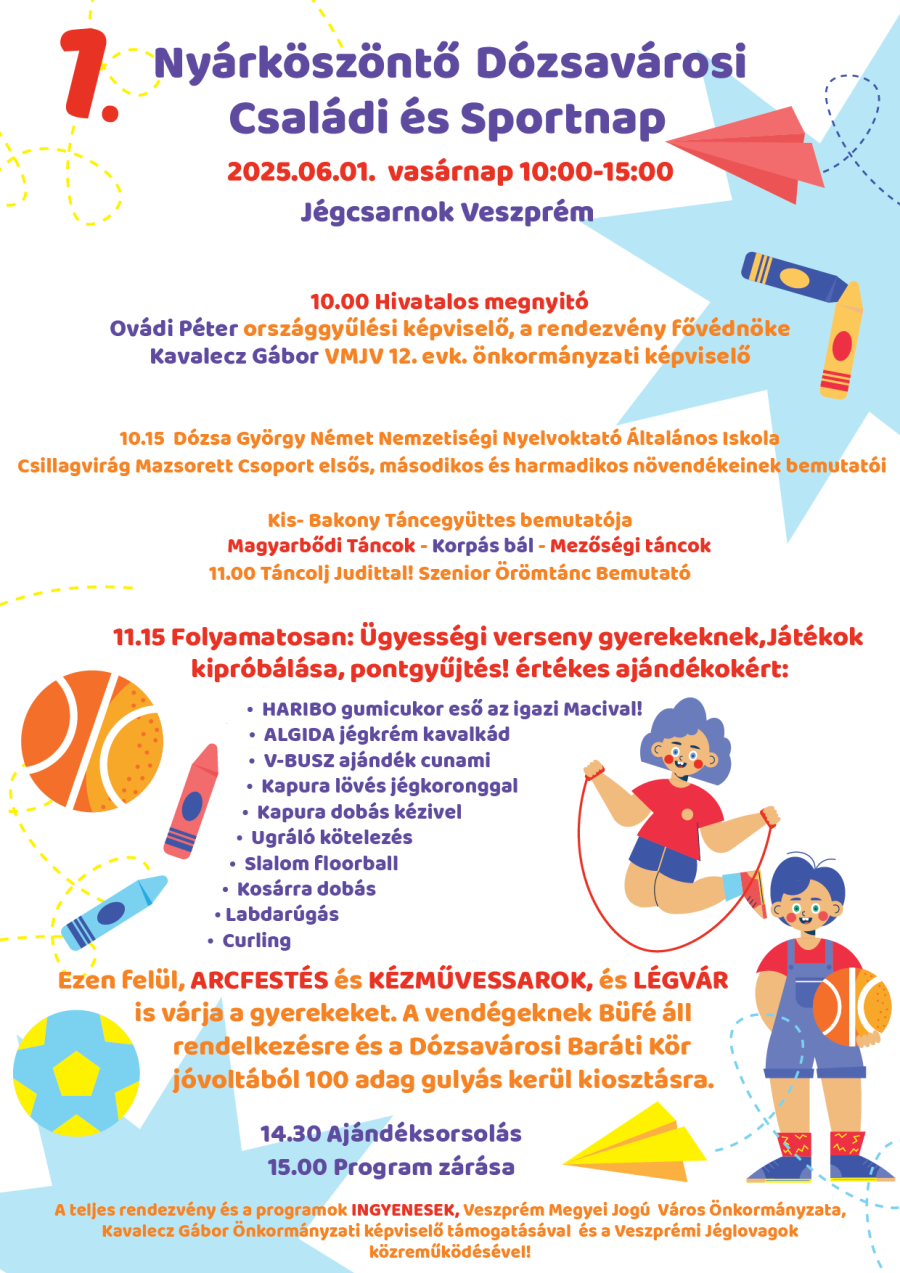 Máhl Krisztián elmondta, az első Nyárköszöntő Dózsavárosi Családi és Sportnappal az is céljuk, hogy megmutassák, a veszprémi jégcsarnok nem csak télen alkalmas arra, hogy közösségi rendezvényeknek legyen a házigazdája, ennél sokkal többre képes az év összes hónapjában, ahogy a mostani alkalom is bizonyítja majd.