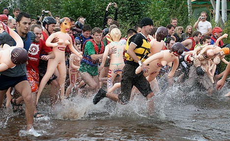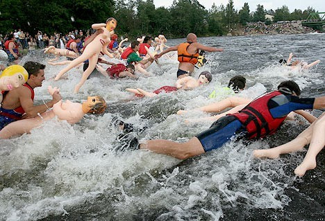 A bizarr, de népszerű, Bubble Baba Erőpróba elnevezésű verseny résztvevői és különös kellékei három percen keresztül estek-keltek Vouksa folyó Losevo zúgóján.