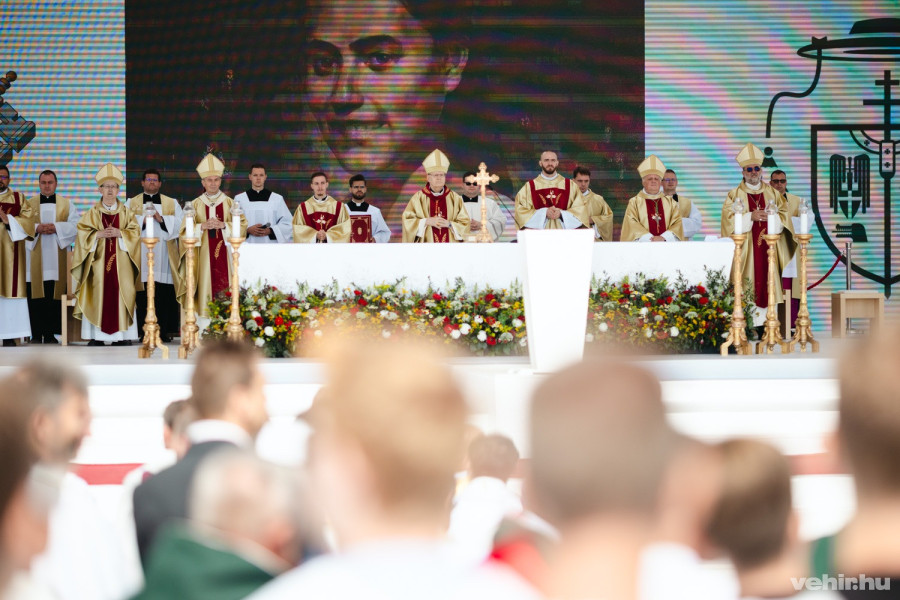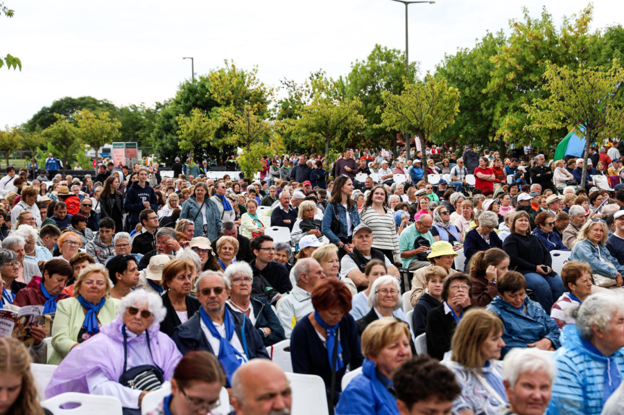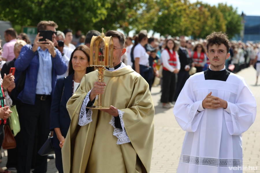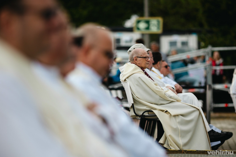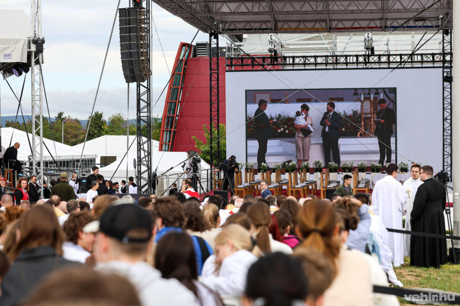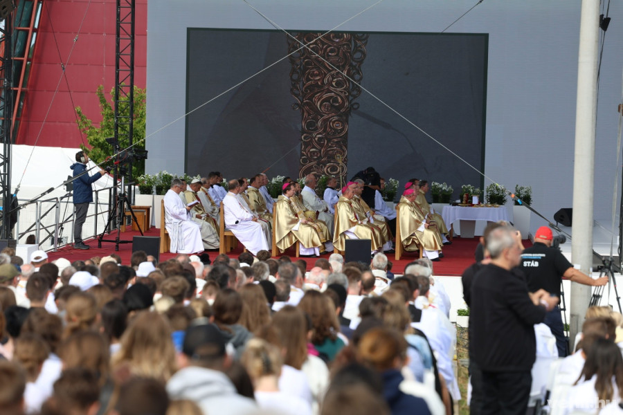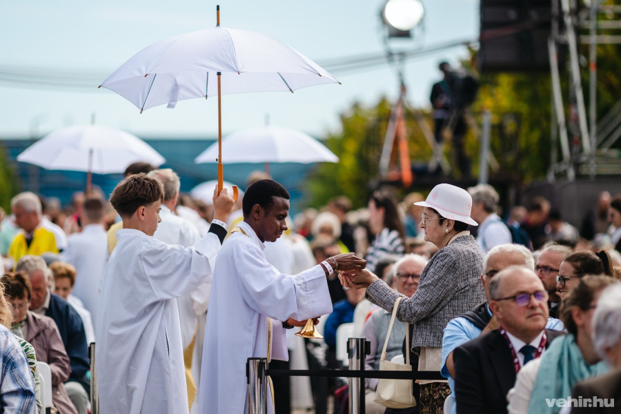 A szervezők mindenre gondoltak: a színpadon az imént jelentették be, hogy gluténmentes ostyával is van lehetőség a szentáldozásra.