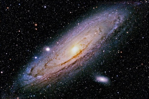Terry Hancock felvétele az Androméda-galaxisról. A sötét porfelhők látványosan kirajzolják egy csillagváros spirális szerkezetét, emellett két halvány kísérőgalaxisa is megfigyelhető a képen