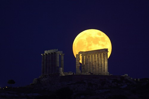 Telihold a nyári napfordulón Poszeidón templomának romjai felett (Anthony Ayiomamitis)