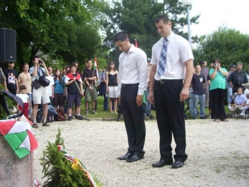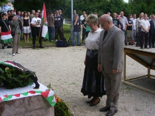 Fazekas László Himnusz című versét, melyet Máté László zenésített meg az Egyetem Kamara Kórusa énekelte. A műsor végén a pártok és szervezetek képviselői helyezték el a megemlékezés koszorúit az emlékmű talapzatánál. Az önkormányzat nevében Baumgartner Lajos önkormányzati képviselő, a Fidesz városi szervezetének képviseletében Bernáth Ildikó parlamenti képviselő, a Fidelitas nevében Óvádi Péter és Ihász Attila helyezték el a megemlékezés koszorúit. Majd a KDNP és a Keresztény Értelmiségiek után, a Történelmi Vitézi Rend, a Munkástanácsok majd legvégül a Mozaik Egyesület képviselői helyezték el a megemlékezés virágait. Legvégül a Szózatot és a Székely Himnuszt énekelte el a tömeg.