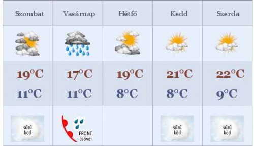 Szombaton hajnalban még sokfelé várható eső, de a délelőtt folyamán lassan szűnni kezd a csapadék. Gyenge vagy mérsékelt északnyugati szél mellett 10 és 14 °C közötti minimumokra van kilátás, többfelé pára- és ködfoltok jelenhetnek meg. Napközben sok lesz a felhő felettünk, de csapadék inkább csak délnyugaton valószínű. Északkeleten délután a Nap is előtűnhet. Mérsékelt marad a légmozgás, délutánra 15-19 °C várható, délnyugaton, ahol később szűnik meg a csapadék lehet kicsit hűvösebb.